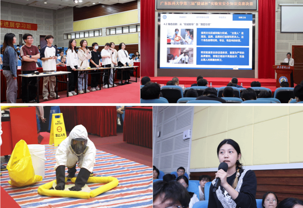 为筑牢校园安全防线,增强师生实验室安全意识,提升师生应急处置能力,11月16日,由学校资产设备管理部、保卫部、学生工作部、校团委联合主办,药学院团委承办、广东捷诚环保科技有限公司支持的广东医科大学第三届“捷诚杯”实验室安全知识大赛决赛在行政楼报告厅举行。学校资产设备管理部、宣传部、药学院、基础医学院等相关部门负责人、教师代表及企业代表出席活动并予以指导。