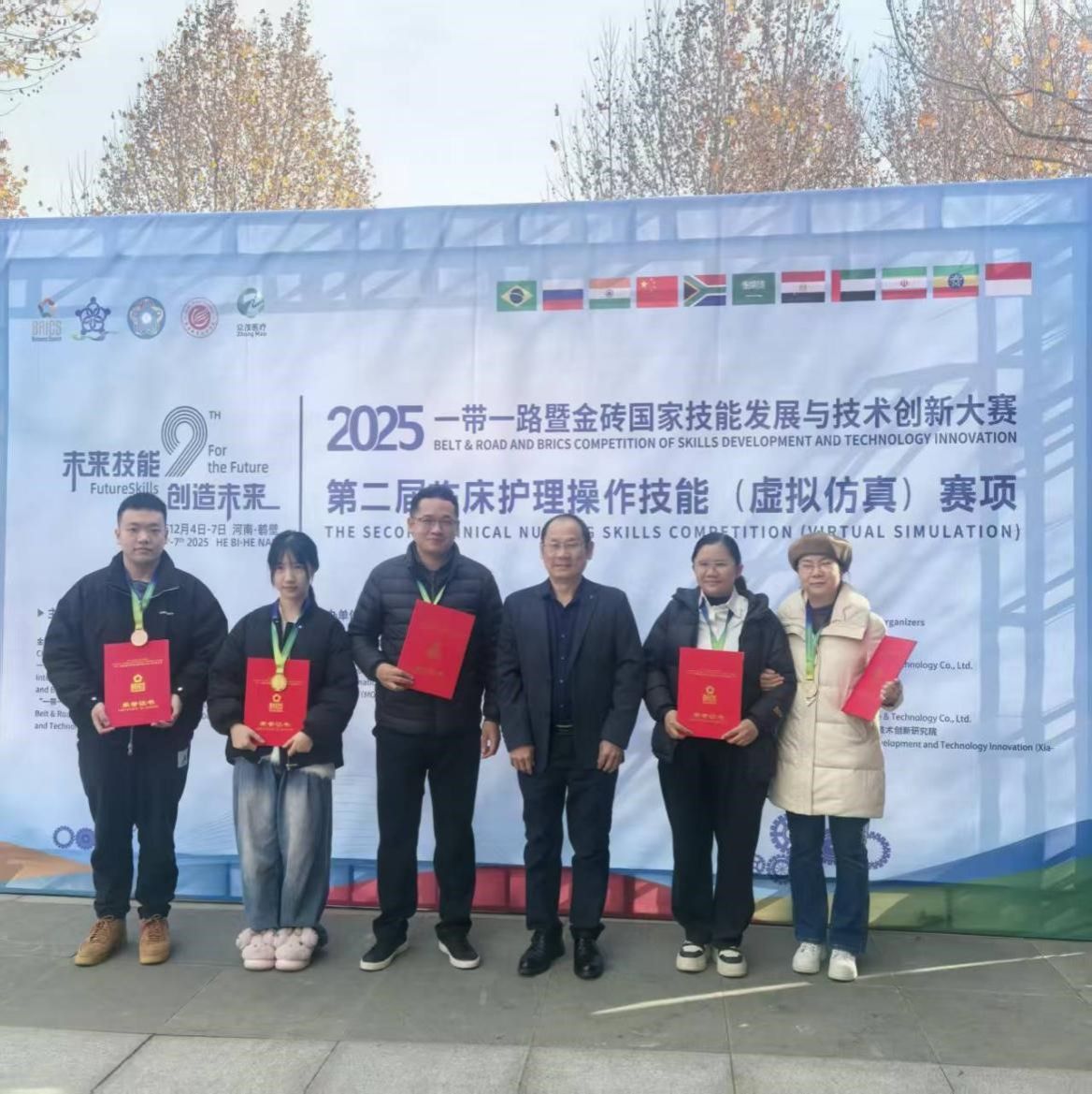 2025年12月6日,“一带一路”暨金砖国家技能发展与技术创新大赛暨第二届临床护理操作技能(虚拟仿真)赛项决赛在河南省鹤壁市圆满落幕。我校第二临床医学院组织师生参赛队伍以扎实的理论功底和精湛的操作技能赢得了评委专家的一致认可。在学生组比赛中,梅菲菲同学获斩获一等奖(金牌)、彭凯、郑单丹同学均获三等奖(铜牌)。教师组中,杨丰、凌志甫和杨如杏老师获二等奖(银牌)、指导教师杨丰荣获“优秀指导教师”称号,我校也凭借出色的组织表现,获得“学生组最佳组织奖”和“教师组优秀组织奖”。
