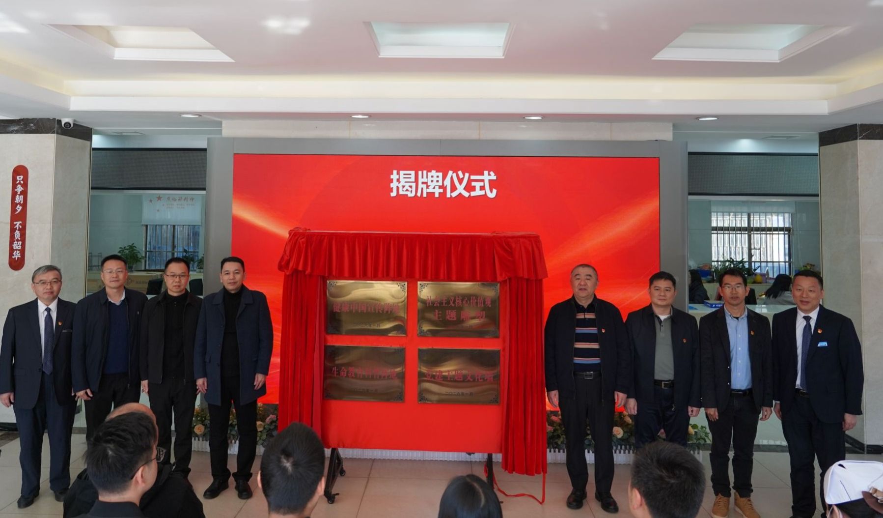 赖焱烽、李耀文、黄伟文和学校机关党委、公共卫生学院党委负责人、附属东莞第一医院领导班子成员、凤凰岗社区领导班子成员共同为“健康中国宣传阵地”“社会主义核心价值观主题雕塑”“生命教育科普阵地”“党建主题文化墙”进行了揭牌。凤凰岗社区党委书记黄贵强为总务后勤部副主任杨军、公共卫生学院副院长刘林华颁发了“社区健康顾问”聘书。“社区健康顾问”后续将对健康副厂长队伍进行针对性培训指导,对社区卫生服务提供指导和决策咨询。附属东莞第一医院随后开展了中医保健专题讲座。