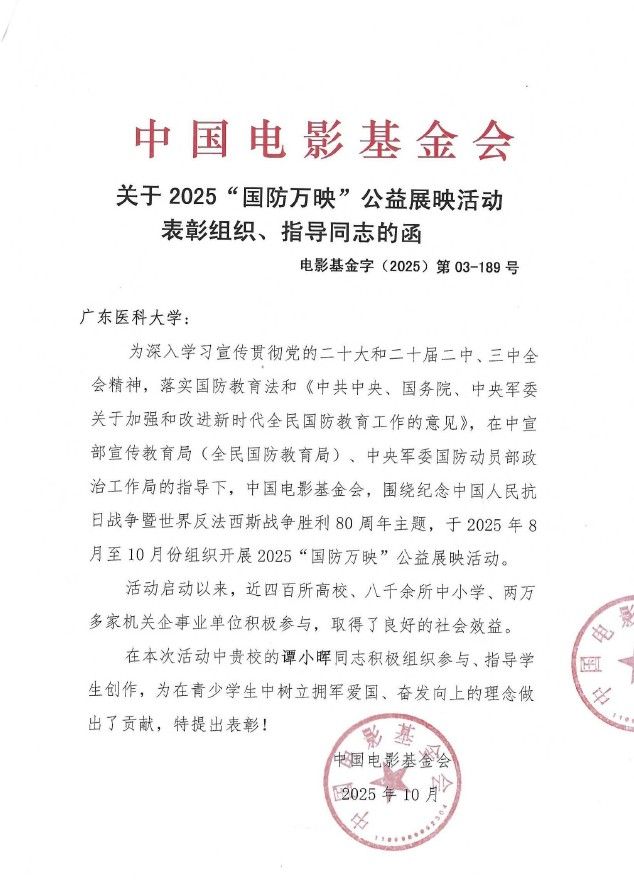 2025年正值中国人民抗日战争暨世界反法西斯战争胜利80周年,本届活动以此为主题,吸引了全国近四百所高校、八千余所中小学及两万多家单位参与,竞争激烈。我校作品凭借深刻的思想内涵与精良的艺术表达,赢得专家评委一致认可,最终斩获殊荣。中国电影基金会特此发函,对负责组织创作的武装部谭小晖老师予以表彰。