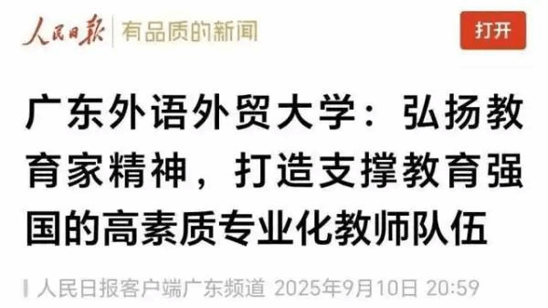 事实上,广东外语外贸大学始终将人才队伍建设作为立校发展之基,着力构建广外特色人才治理模式和发展路径,全力锻造政治坚定、师德高尚、教学优秀、学术卓越的高素质专业化教师队伍。2025年9月10日,第41个教师节之际,人民日报聚焦广东外语外贸大学打造支撑教育强国的高素质专业化队伍,对广东外语外贸大学打造高水平教师队伍的经验进行了聚焦报道。
