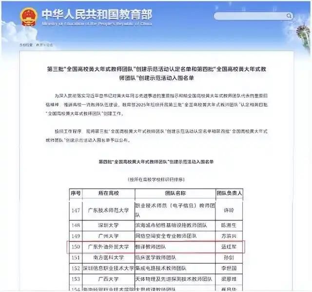 为大力弘扬黄大年同志“心有大我、至诚报国”的崇高品格,引导广大教师在加快建设教育强国的新征程中展现更大担当作为,教育部于近日正式公布第四批“全国高校黄大年式教师团队”创建示范活动入围名单,广东外语外贸大学蓝红军教授担任负责人的“翻译教师团队”成功入选,实现广东外语外贸大学在该国家级荣誉上的历史性突破。
