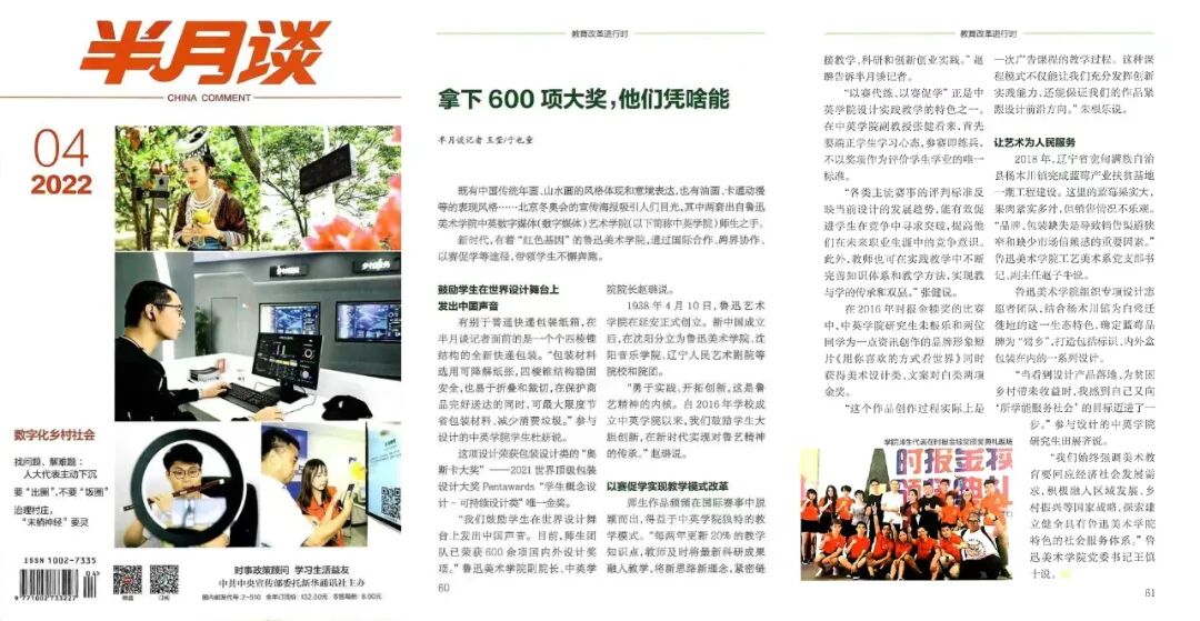 TheOneClubCreativity权威发布艺术类获奖排名中,2022年鲁迅美术学院在大中华区高校排名第一,全球高校排名第十,团队典型事迹被《人民日报》《半月谈》等媒体相继报道。