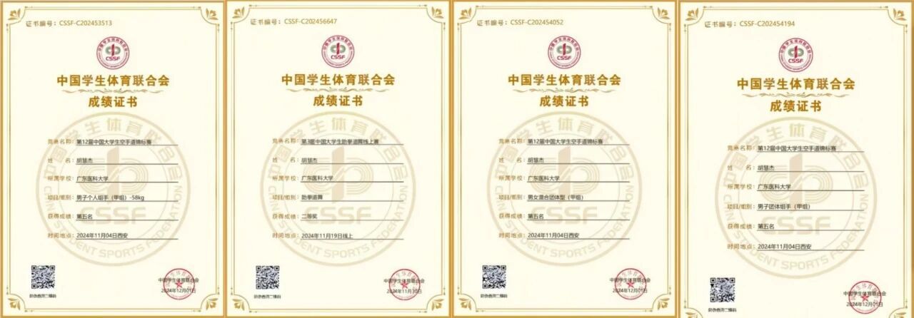 胡慧杰始终以“体育强国”为己任,多次代表学校征战国家级重大赛事,屡创佳绩。作为校空手道队队长,他累计组织训练超600小时,个人斩获国家级奖项10项、省级奖项30项,刷新学校在省级体育赛事中金牌数与奖牌数的历史纪录,让广东医科大学的旗帜在赛场上高高飘扬。