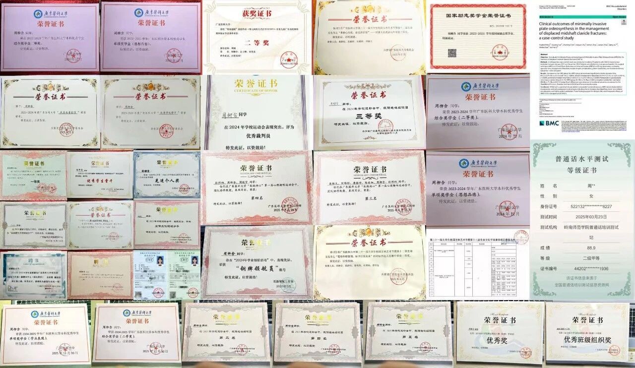 同时,周柳含也逐渐找到属于自己的学习节奏,在大三学年学业综合排名位列专业第四,一次性考取英语六级、普通话二甲等证书,课余参与学科竞赛,获广东医科大学2025年“挑战杯”大学生创业大赛优秀奖、院赛二等奖。作为队长与团队参赛获科研标书达人大赛二等奖、科研文献综述大赛优秀奖。